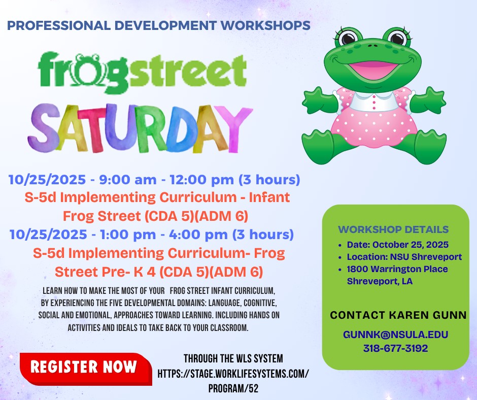 NSU S-5d Implementing Curriculum- Frog Street Infant (CDA 5) (ADM 6) Learn how to make the most of your Frog Street Infant curriculum by experiencing the five developmental domains.